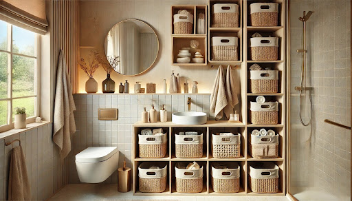 Dekoratif sepetler, çeşitli ebatlarda gelir ve banyo malzemelerinizi organize etmek için çok ışe yarar. Ayrıca, ürünlerinizi kolayca erişilebilir bir yerde tutabilirsiniz.