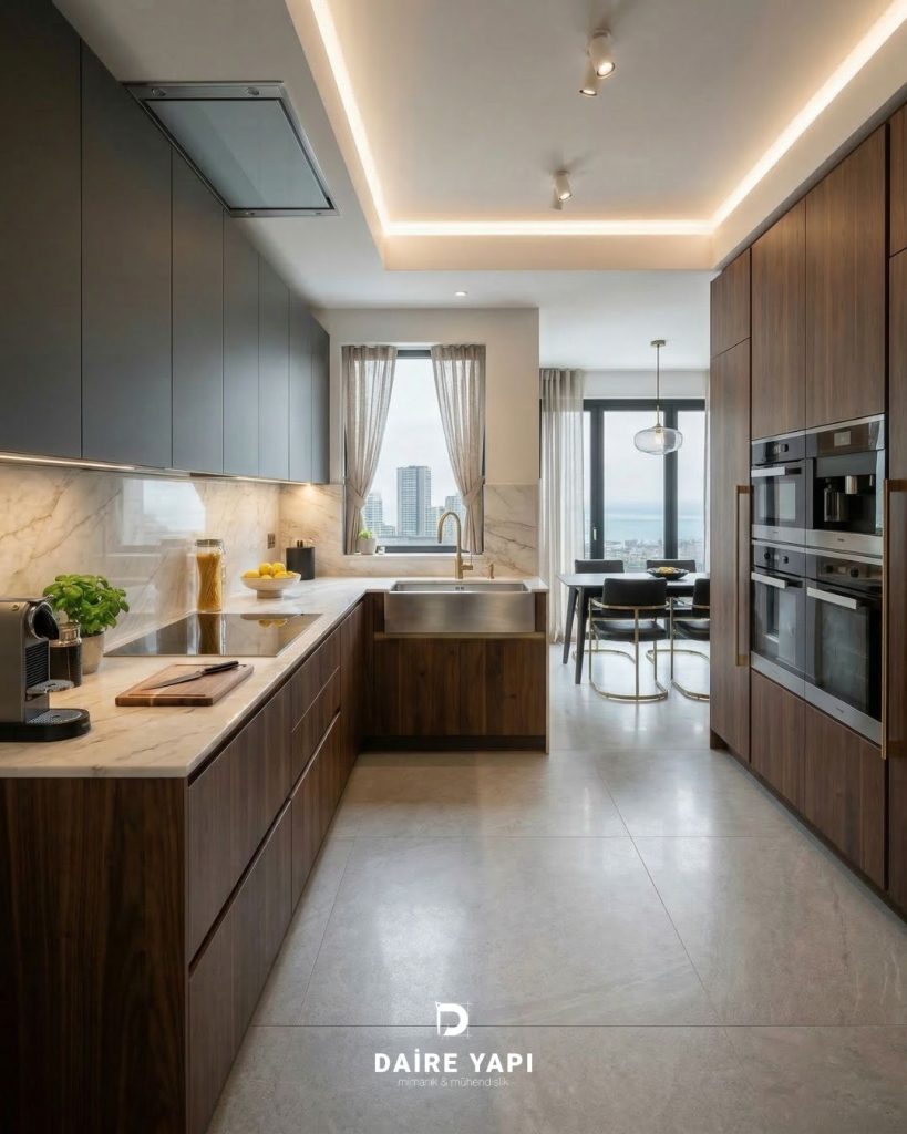 Tezgâh, dolap, duvar ve zemin ilişkisi bütüncül biçimde ele alınmış; mutfağın yalnızca bir hazırlık alanı değil, aynı zamanda güçlü bir tasarım alanı olması amaçlanmıştır.