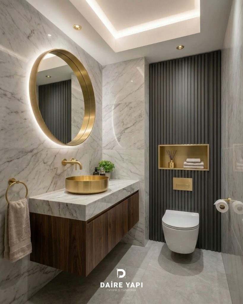 Proje kapsamında banyo ve tuvalet alanları da tamamen yenilenmiştir. Bu bölümlerde hem hijyen hem de görsel bütünlük ön planda tutulmuş; seramik seçimlerinden depolama çözümlerine, armatürlerden aydınlatmaya kadar tüm detaylar yeniden değerlendirilmiştir.