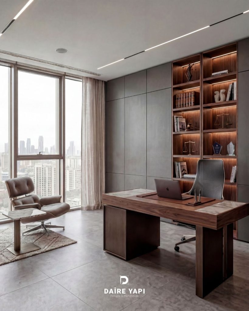 Çalışma odasında oluşturulan tasarım anlayışı, yalnızca fonksiyonel değil aynı zamanda motive edici ve dengeli bir atmosfer oluşturmayı amaçlamıştır. Böylece evin diğer yaşam alanlarıyla uyumlu ama kendi işlevine özel karakteri olan bir çalışma alanı ortaya çıkarılmıştır.