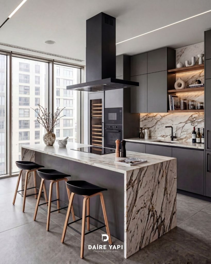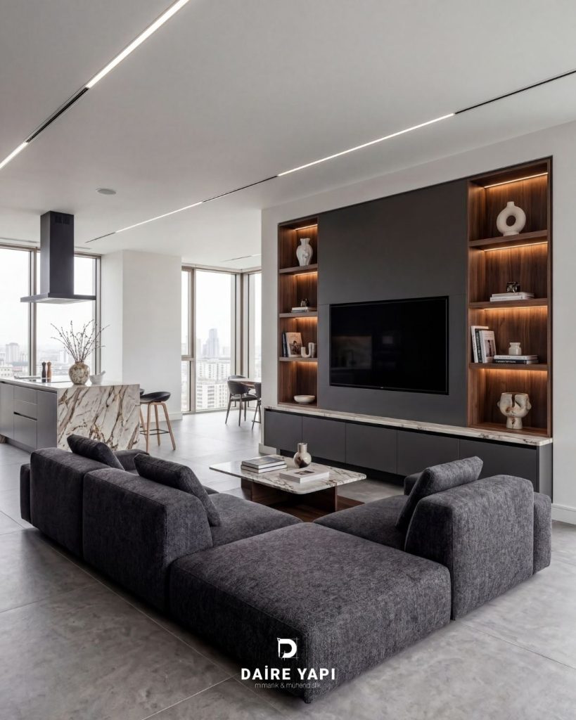 Daire Yapı Mimarlık Mühendislik olarak bu projede yalnızca uygulama sürecini değil, projenin en başından itibaren tüm aşamalarını tek elden yönettik. Mimari çizim süreci, alan planlaması, malzeme seçimleri, özel üretim mobilya kararları, uygulama koordinasyonu ve son teslim aşamasına kadar tüm süreçler tarafımızdan profesyonel bir bütünlük içerisinde yürütüldü.