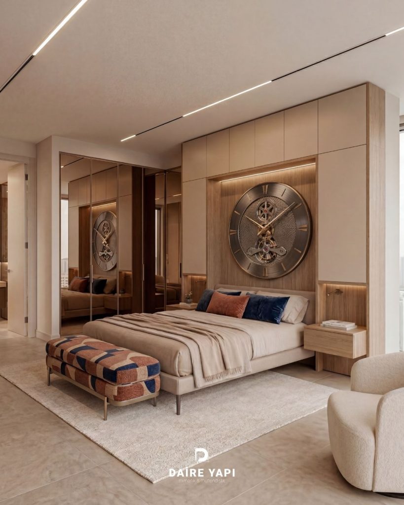 Yatak odasında tercih edilen tasarım dili, evin genel dekorasyon yaklaşımıyla uyum içinde olacak şekilde kurgulanmış; sade ama etkili detaylarla desteklenmiştir. Böylece dinlenme alanı niteliğini güçlendiren, şık ve uzun ömürlü bir mekan tasarımı elde edilmiştir.