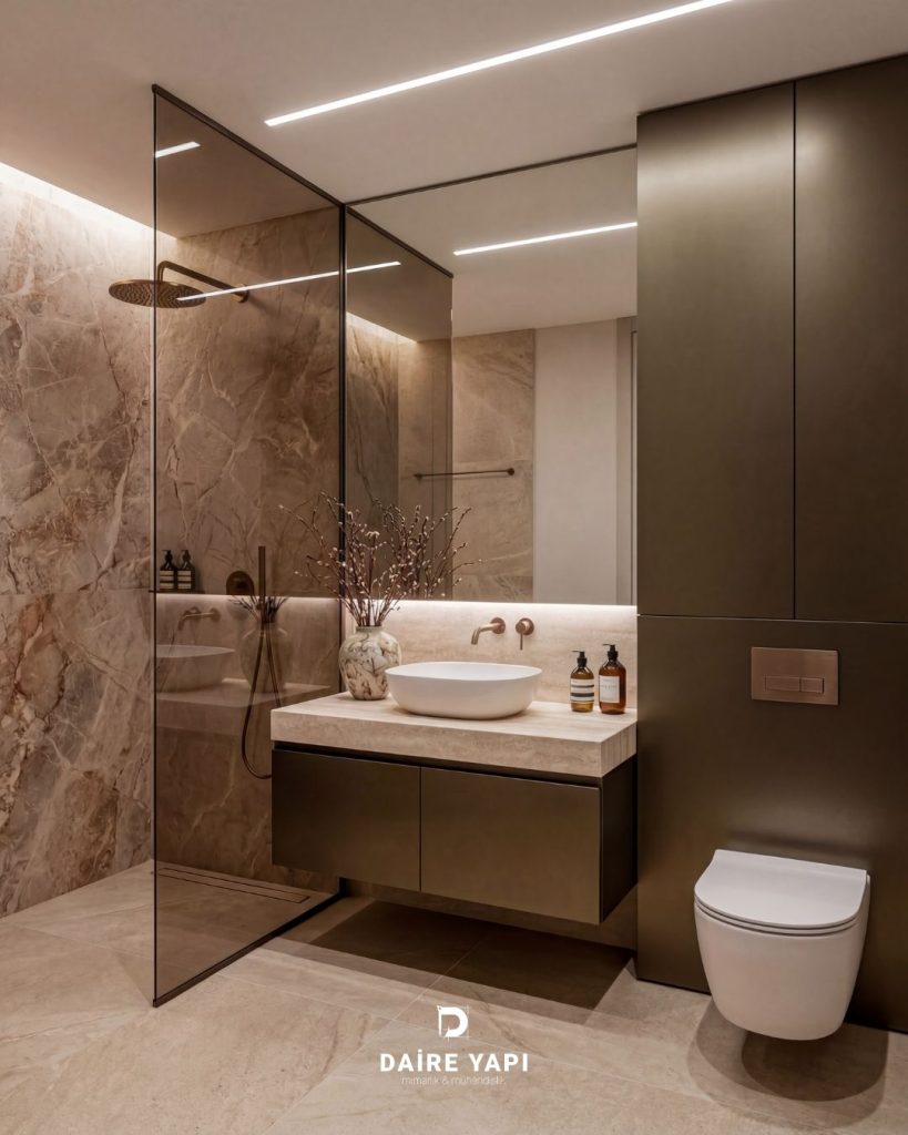 Banyoların her birinde daha düzenli, daha sade ve daha modern bir atmosfer oluşturulması hedeflenmiştir. Depolama çözümleri, kullanım kolaylığı sağlayan yerleşim kararları ve malzeme uyumu ile banyo alanları evin genel tasarım karakteriyle uyumlu hale getirilmiştir. Böylece hem günlük kullanımı destekleyen hem de estetik açıdan güçlü duran ıslak hacimler elde edilmiştir.