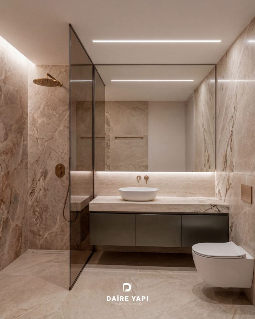 Projede yer alan 2 adet banyo da kendi kullanım ihtiyaçlarına uygun şekilde yeniden tasarlanmıştır. Her iki banyo alanında da estetik görünüm, işlevsellik ve kullanım konforu bir arada düşünülmüş; yüzey seçimlerinden mobilya detaylarına kadar tüm unsurlar bu anlayış doğrultusunda şekillendirilmiştir.