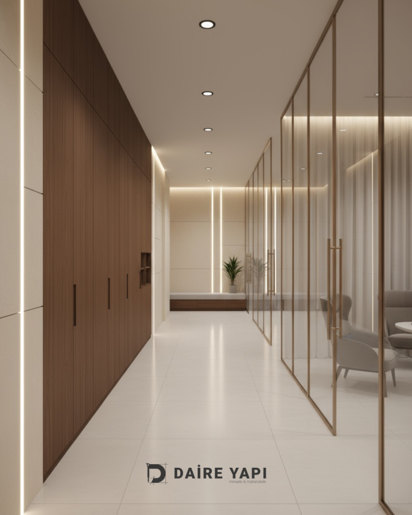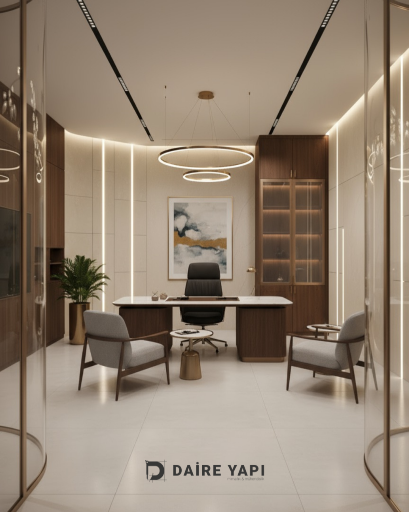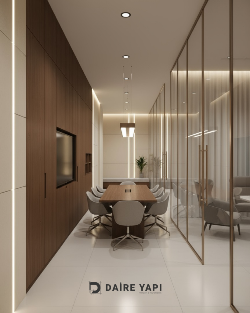 Daire Yapı Mimarlık Mühendislik olarak, modern iş dünyasının ihtiyaçlarına uygun, kurumsal kimliği yansıtan ve çalışanların verimliliğini artıran anahtar teslim ofis tasarım projeleri geliştiriyoruz. Bu kapsamda, İstanbul’da prestijli bir rezidansta yer alan kurumsal firmanın ofisini baştan sona yenileyerek hem estetik hem de işlevsel bir çalışma ortamı oluşturduk. Projede mimari çizimden uygulamaya, malzeme seçiminden elektrik–mekanik çözümlere kadar tüm süreç profesyonel ekibimiz tarafından yönetildi.