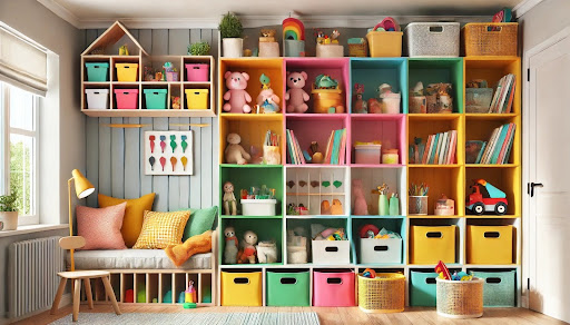Renkli kutular, çocukların oyuncaklarını düzenlemelerine yardımcı olur ve odaya eğlenceli bir görünüm kazandırır.
