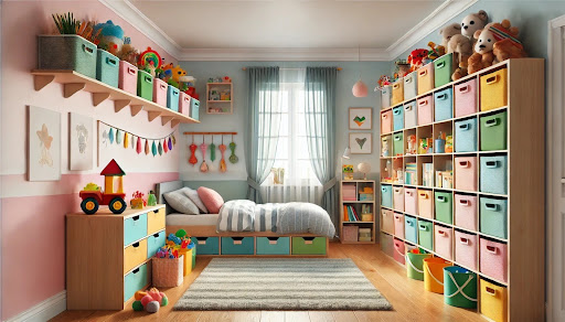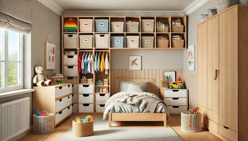 Fonksiyonel dolaplar, yatak altı depolama çekmeceleri ve duvar rafları, çocuk odaları için en iyi depolama çözümleridir.